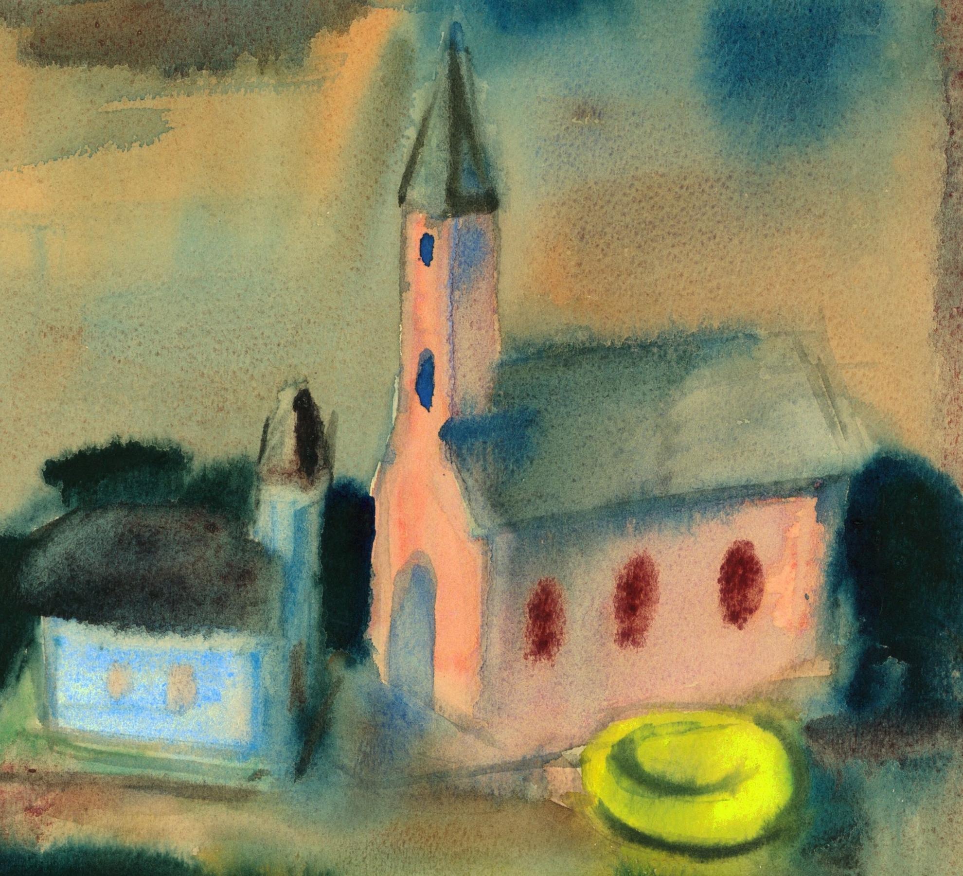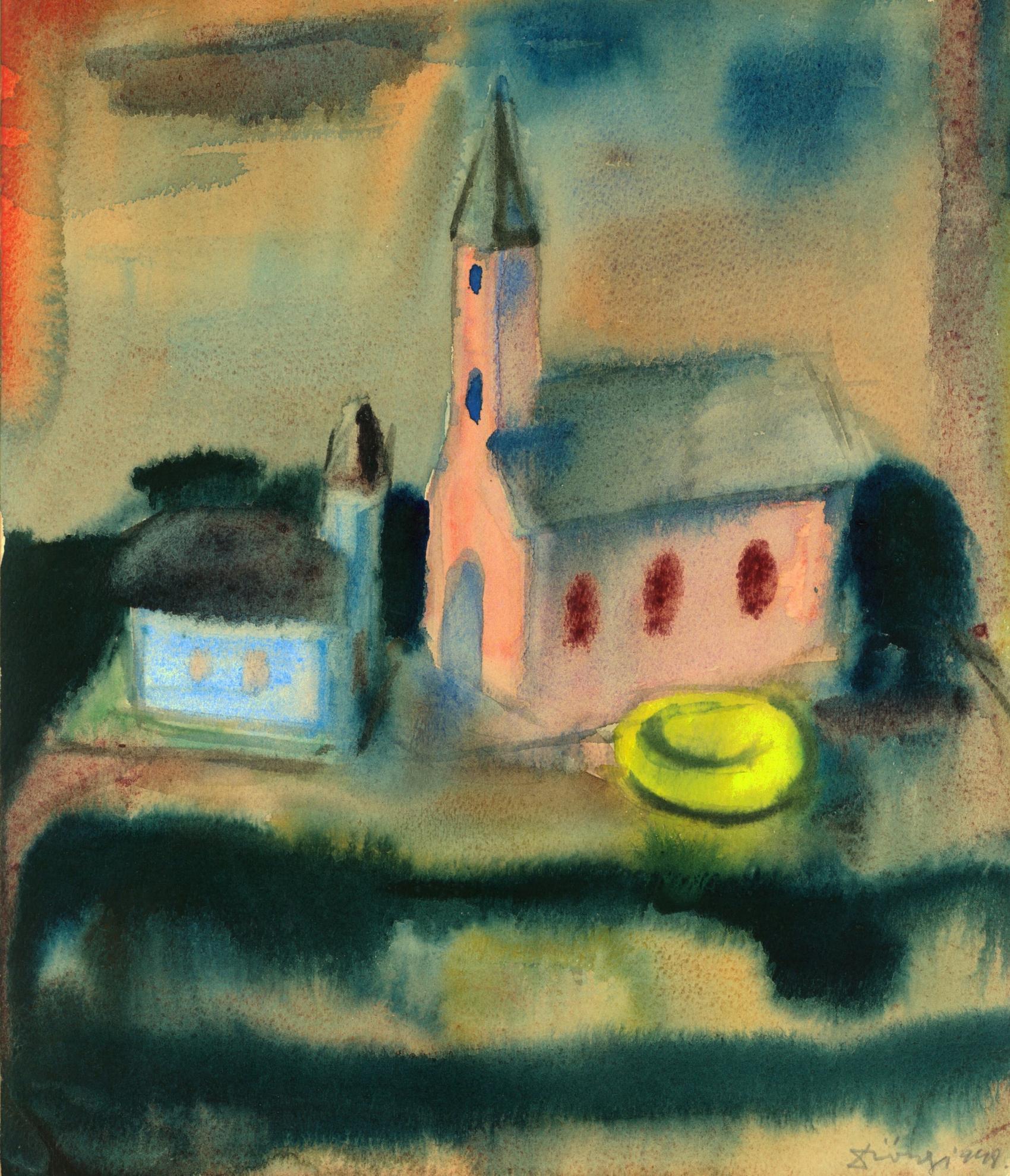 Ennek az 1948-as esztendőnek, amikor még ki kellett tartani, ennek a terméke ez a templomokat ábrázoló akvarell, amely minden bizonnyal egy technika bemutatása, egy ujjgyakorlat volt, a korrigáló tanár alkotása. Szinte látjuk magunk előtt, ahogy a mester vízbe mártja a papírt, majd széles, gyors ecsetvonásokkal ráviszi alul a két sor sötét és két sor világoskéket, a festék megfolyik, de épp csak annyira amennyire kell ahhoz, hogy egy magaslat hatását keltse, a sötétkékből kerül a kép közepére is kétoldalt, majd egy kevés fentre, de itt már valamivel halványabban, az eget szimbolizálva. Az égen bal felől, mintegy ellenpontozva a sok kéket, egy pirosas csík húzza meg magát. A kép közepét két templom uralja, két egymással furcsán szembenéző templom, egy magas halványpiros falú, három barna ablakkal, és egy kis halványkék, melyre fentről néz a nagy, és melynek meleg színei mintegy ellenpontozzák a sok kéket, fókuszba gyűjtve a fényeket. A fókusz élezésének kedvéért a nagyobbik templom oldalában egy rikító sárga paca van, talán virággrupp. A két templom megfestésekor a mester hagyta már egy kicsit száradni a papírt, mert élesebb vonalakra, tisztább kontúrokra volt szüksége. Ha eltávolodunk egy kicsit a képtől, akkor két templomot látunk egy domboldalon, a körülöttük villódzó kékek néha kicsit türkiznek is tűnnek a mélyükön egy kis zölddel, és érezzük, hogy bármennyi idő alatt, bárkiknek is készült ez a kis akvarell, azokban a templomokban lakik valaki.